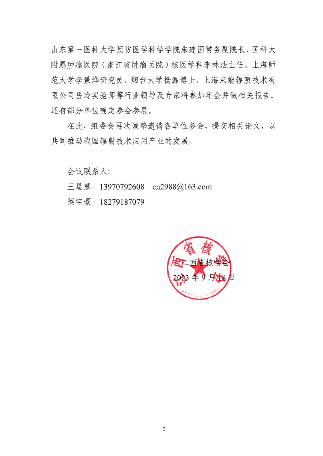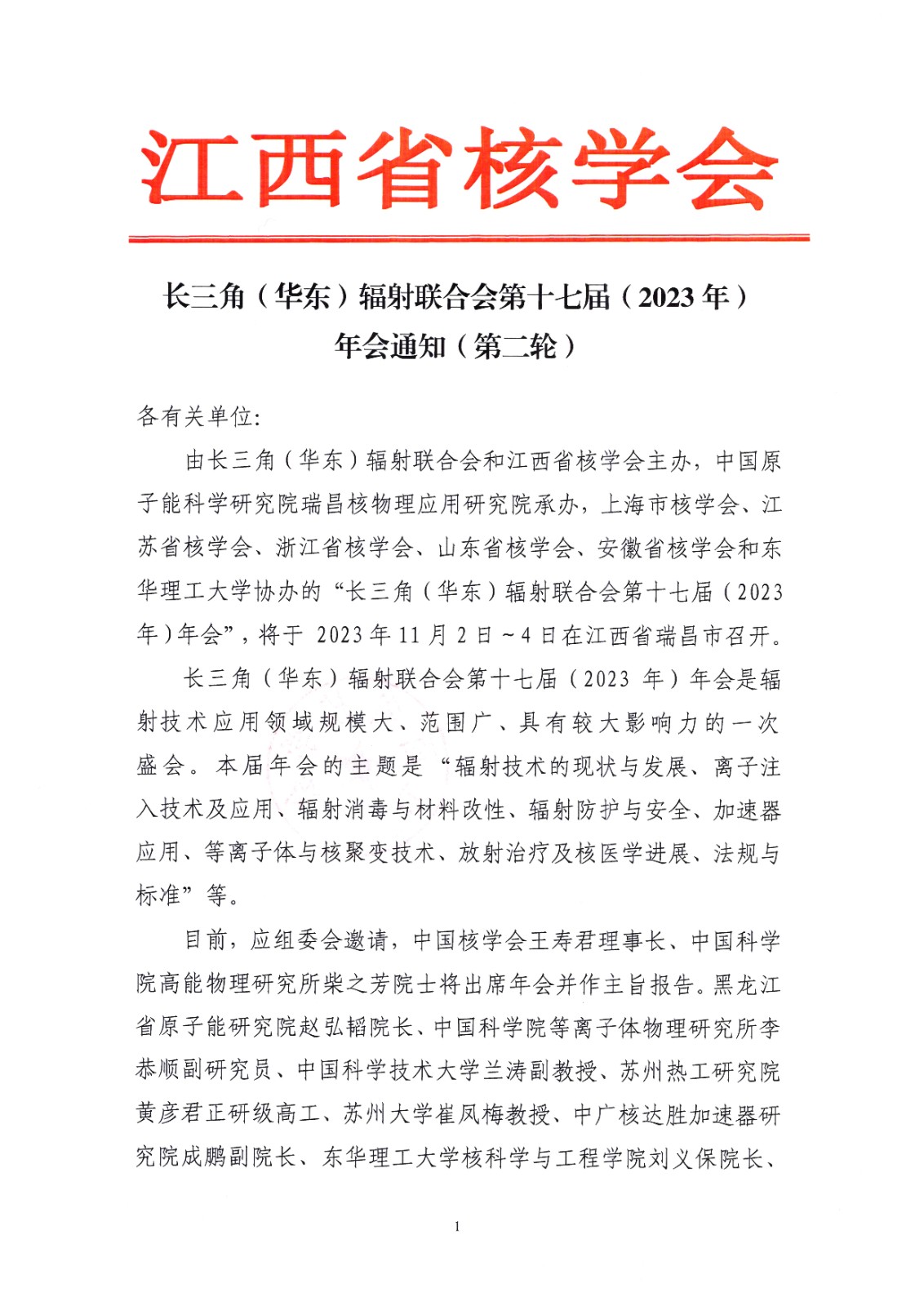 長三角(華東)輻射聯(lián)合會第十七屆(2023年)年會通知(第二輪) 發(fā)布時間:2023-09-21 作者: 管理員 閱讀量:7205 附件1 參會回執(zhí).doc附件2 論文模板.doc 上一篇:2023年全國放射化學(xué)發(fā)展戰(zhàn)略與學(xué)術(shù)交流大會第一輪通知 下一篇:長三角(華東)輻射聯(lián)合會第十七屆(2023年)年會成功舉辦