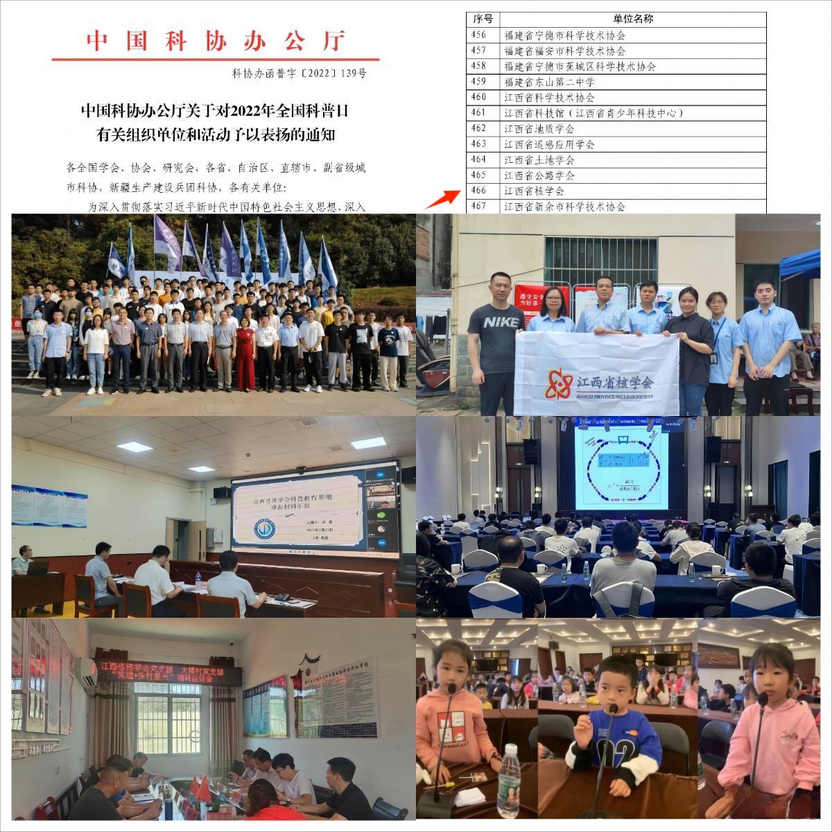 近日,中國科協(xié)辦公廳發(fā)布《關(guān)于對2022年全國科普日有關(guān)組織單位和活動予以表揚(yáng)的通知》(科協(xié)辦函普字〔2022〕139號),江西省核學(xué)會被中國科協(xié)評為2022年全國科普日優(yōu)秀組織單位。